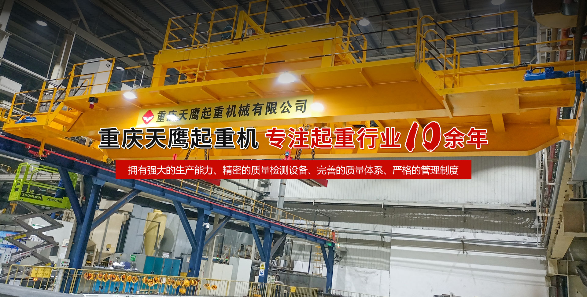 重慶天鷹起重機械有限公司成立于2014年,主營起重機的銷售、安裝和維護等相關(guān)服務(wù)。中國重型機械工業(yè)協(xié)會員單位、為中國工程機械工業(yè)協(xié)會工程機械維修分會會員單位及西南地區(qū)起重機械定點安裝維修單位。具有國家質(zhì)量監(jiān)督檢疫總局頒發(fā)的特種設(shè)備安裝維修改造質(zhì)格證書。并率先通過了IS09001-2000質(zhì)量體系認證?! 」咀再Y金3000萬元;廠房面積2萬平方米;各種生產(chǎn)檢測設(shè)備50臺套,公司技術(shù)力量雄厚,聘請了國內(nèi)知名起重機專家、工程技術(shù)人員擔(dān)當(dāng)項目經(jīng)理、技術(shù)總工程師及顧問?,F(xiàn)擁有員工100多人,其中工程技術(shù)人員12人?! ≈鲗?dǎo)產(chǎn)品為各類橋、門式起重機及輕小型起重設(shè)備,具備生產(chǎn)起重量200t及以下通用橋、門式起重機的能力,尤其在200t以下起重機產(chǎn)品上具備較強的市場競爭力,為許多行業(yè)設(shè)計制造了技術(shù)含量高、技術(shù)性強的起重設(shè)備,許多產(chǎn)品在原設(shè)計標準上進行了較大的改進、優(yōu)化和創(chuàng)新;其中NH型系列電動葫蘆、HD型電動單梁處于國內(nèi)高水平..... 好的產(chǎn)品品質(zhì)需要由較高的裝備水平來保證,公司購買了“大型數(shù)控落地鏜”、“數(shù)控切割機床”、“自調(diào)式焊接滾輪機”、“數(shù)顯液壓板料折彎機”、“超大型數(shù)控臥式車床”、“數(shù)控液壓水平下調(diào)式三輥卷板機”、“單柱移動式立式車床”“擁有用于單梁生產(chǎn)的全國一條拋丸噴漆烘干線、葫蘆噴漆烘干線和全國較大的100T葫蘆試驗臺和檢測中心”等各種先進的加工設(shè)備,新建廠房面積近2萬平方米?! ≠|(zhì)量是企業(yè)的生命,天鷹公司依據(jù)“ISO 9001國際質(zhì)量管理體系”標準,制定并完善了公司的質(zhì)量管理體制。堅持質(zhì)量體系的內(nèi)審和外審,將質(zhì)量管理工作落實到企業(yè)生產(chǎn)經(jīng)營的全過程?! ∧奈⑿?,是天鷹永恒的追求;天鷹的服務(wù),是您首要的選擇!因為我們堅信:“誠信是本、質(zhì)量鑄就品牌”。為您服務(wù)是我們的榮耀,勤奮而進取的天鷹人,時刻期盼著您的到來。